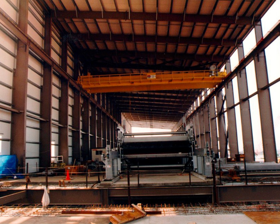 The processes and equipment used in the paper production operation required a number of special building applications. SP-6 surface preparation on all primary steel with a two-coat epoxy paint system and G90 galvanized purlins and girts were used to resist corrosion. Elevated floor slabs were designed to support up to 800 psf equipment loads, and 70′ long crane girders were designed to support a 35-ton clamshell crane in the barge unloading area.