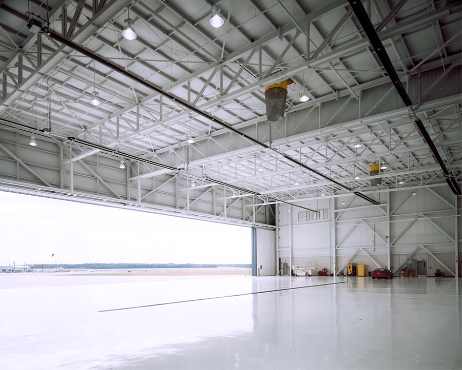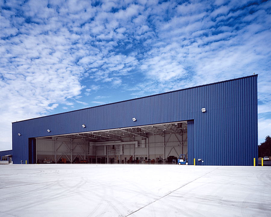 Built for Air Castle, an executive jet charter company, this 23,000-square-foot hangar was the first of several expansion projects at the Millville, NJ airport. The 196′-clearspan hangar was designed and supplied by Butler Heavy Structures and utilizes a reverse-frame design. A 17′-deep “supertruss” spans the width of the building above the hangar doors.