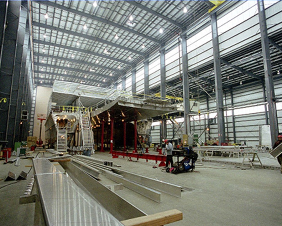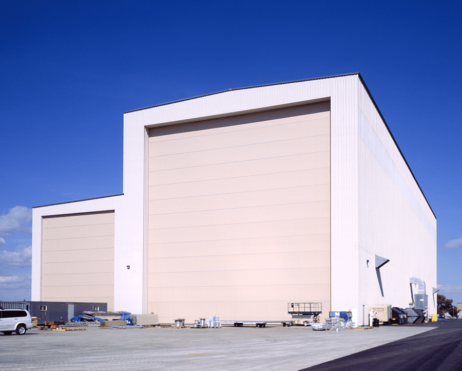 We’ve done planes and trains…now we’re doing ships! Butler Heavy Structures provided the design and engineering for this 45,000-square-foot shipbuilding facility. Although this square footage isn’t a typical Butler Heavy Structures type of project, Butler Heavy Structures was brought into the plan by the local builder due to the building’s height and use of Megadoors®. The main assembly building is a 100′-wide clearspan, 300′-long and 86′-6″ at the shorter end and 89′-6″ at the taller end. The floor has a 3′-slope down the length of the building. At one end of the building, there is an 80’x75′-clear Megadoor® with structurals in place for the future installation of one in the other end.