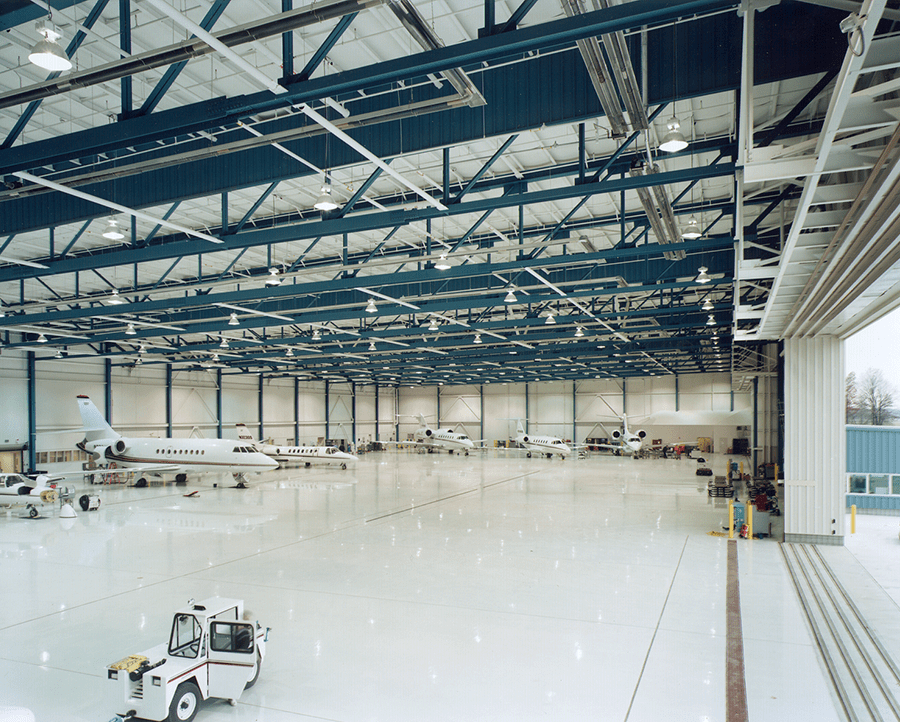 The centerpiece of this 124,000-square-foot business jet maintenance base is a 190′-wide clearspan hangar. The front-to-back single slope provides for over 80,000 square feet of column-free interior space. Aircraft access the building through two 100′-wide hangar doors on the high sidewall.