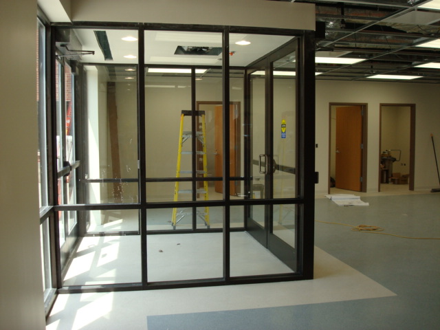 Project features include an automated ADA and air locked entry system, suspended (central plant supported) HVAC, drop ceilings, and VCT flooring. Composite masonry veneer exterior was added to match existing exterior, painted MR-24® roof, fire sprinkler and alarm system, and a new storefront entrance was added to the existing adjacent stair tower.